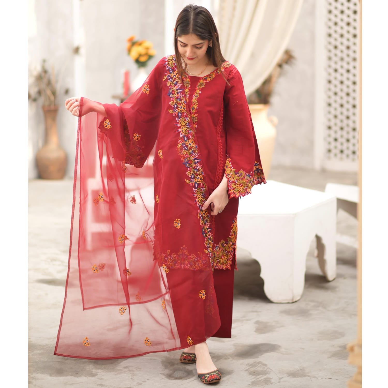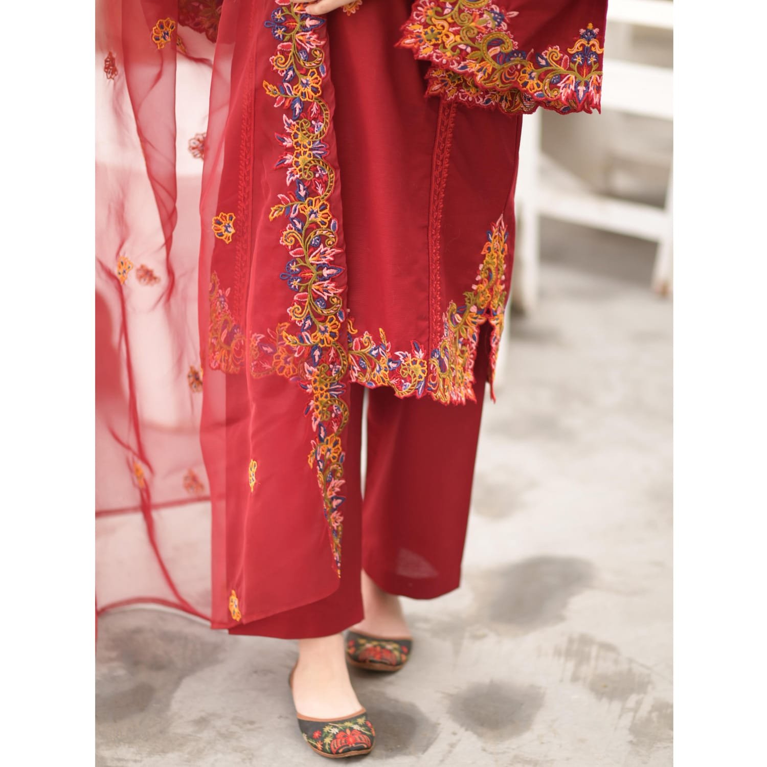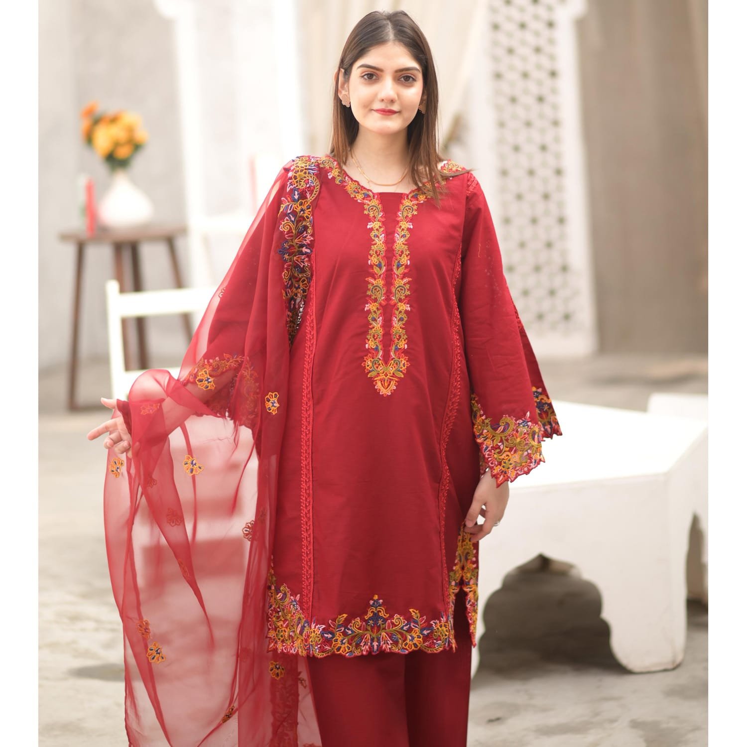 Embroidered Dupatta, Plain Trouser
